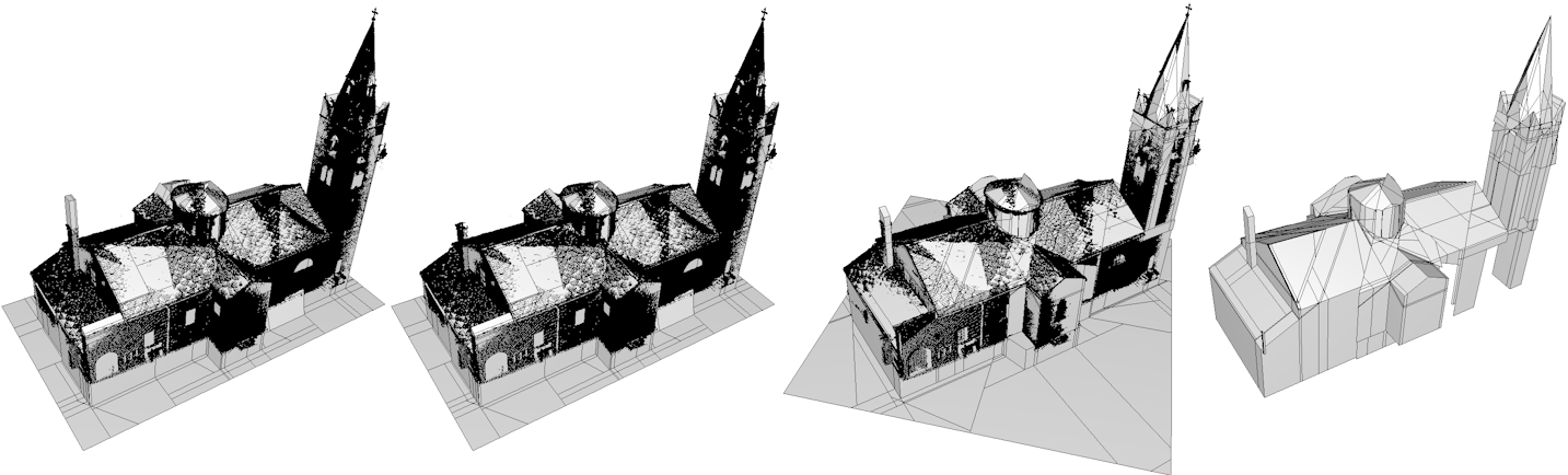 From left to right: 1. & 2. Reconstruction with using \(\lambda = 0.7\) and \(\lambda = 0.8\). A higher value of lambda removes some details on the roof as well as the chimney. As no planar shape was detected at the top of the chimney, the kinetic space partition does not offer a volume that well covers the point cloud. The volume of the chimney is either too large for \(\lambda = 0.7\) or gets cut completely for \(\lambda = 0.8\) 3. Reconstruction of the model without reorienting the bbox. For the reconstruction to succeed it is necessary to set the external_node for ZMIN to inside as the point cloud does not close the church from below. 4. Reconstruction as in 3., but without setting external_node for ZMIN.